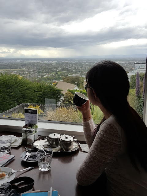 | Enjoying the panoramic view of Christchurch while having a cup of hot camomile and a piece of lemon cheese cake at The Cup Cafe |